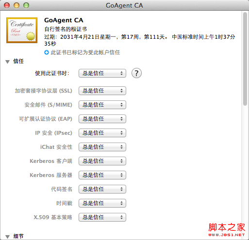 三、右鍵選擇新導入的GoAgent CA證書,選擇[顯示簡介],然后選擇展開[信任]一欄,確保所有的選擇都是[總是信任]。