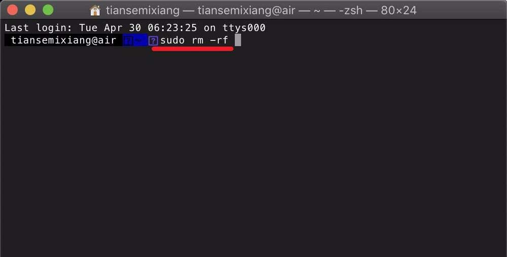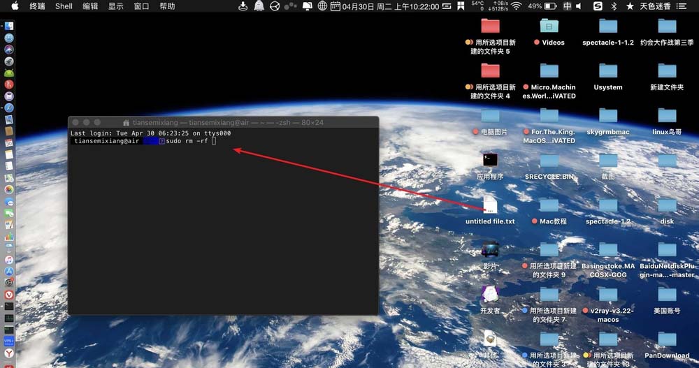 4、點擊終端,輸入刪除的命令行:【sudo rm -rf】。