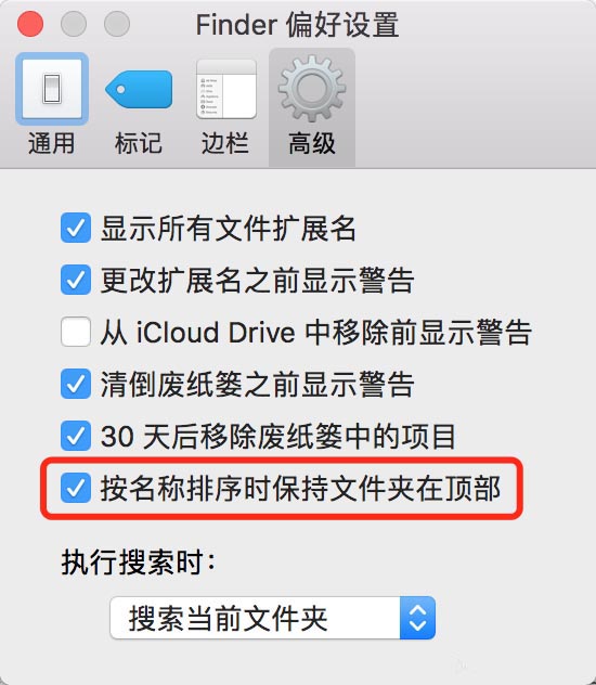 4、在 Finder 偏好設(shè)置中的「高級(jí)」欄目下,可以看到「按名稱排序時(shí)保持文件夾在頂部」這個(gè)選項(xiàng),勾選并退出設(shè)置即可。