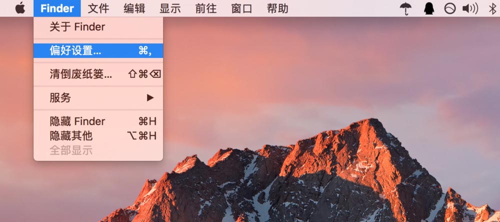 3、首先請(qǐng)?jiān)?Mac 上打開(kāi) Finder 應(yīng)用,然后再點(diǎn)擊頂部 Finder 菜單中的「偏好設(shè)置」選項(xiàng),如圖所示。
