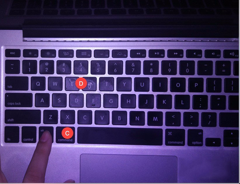 先關機,按住鍵盤上面是cmmand+r,接著按開機鍵。Mac將會重啟。如下圖的紅色英文CD。