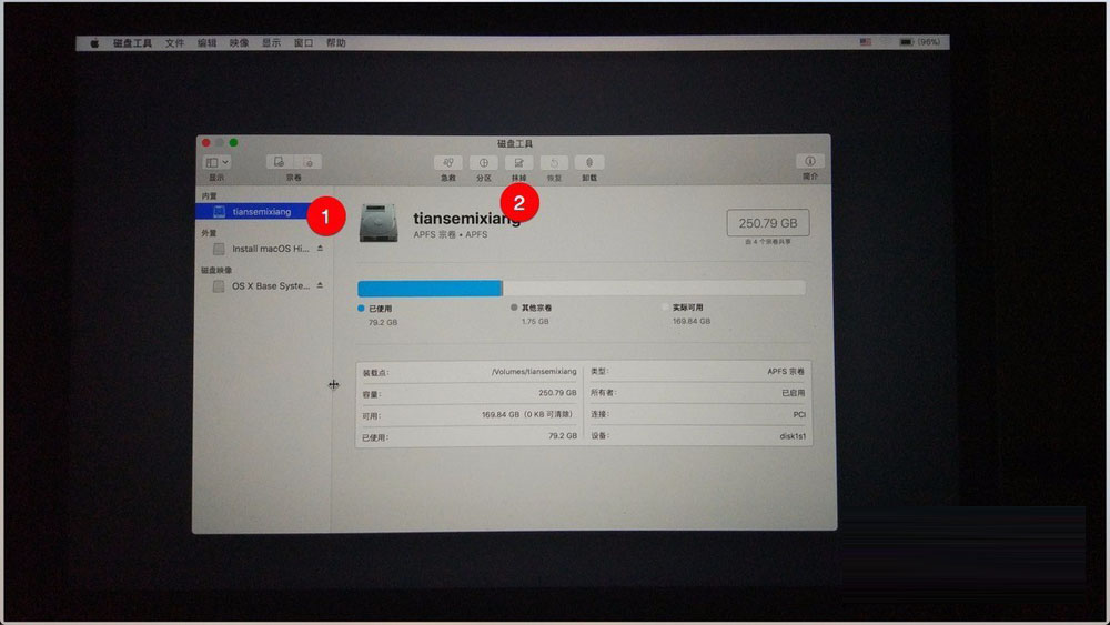 6、在圖一按照一二點擊選擇,在圖二選擇抹掉。這個過程會把Mac上面的所有的數據抹掉,等于格式化。