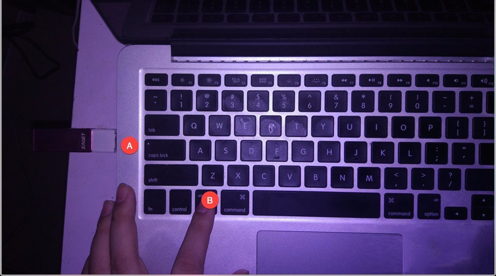 關機把啟動盤插入到圖中數字1位置,食指按住數字2的位置,按開機鍵。