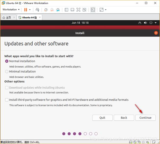 5)在“Update and other software”選項中,建議取消勾選“Download updates while installing Ubuntu”,這樣在安裝過程中只會安裝原生系統,不會聯網進行系統更新,會大大節省安裝系統的時間;另外,建議選擇“Normal installation”選項,該選項會為系統配置圖形界面,若選擇“Mininal installation”,則為最小系統安裝,無圖形界面,對于桌面系統來說使用多有不便;