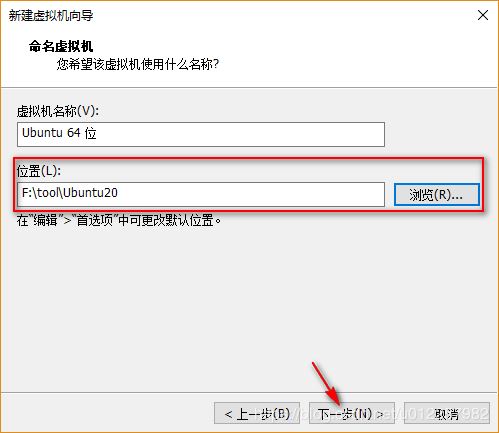 6)在“命名虛擬機”頁面,對所要創建的虛擬機進行命名,并指定虛擬機存放的位置,點擊下一步;