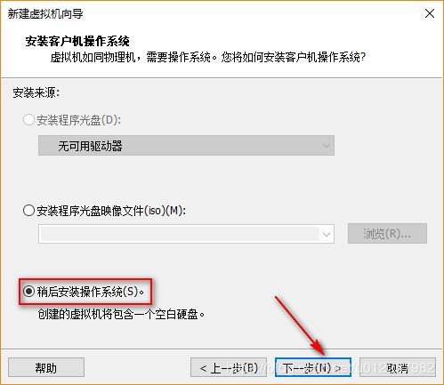 4)在“安裝客戶機操作系統”選項中,選擇“稍后安裝操作系統”,點擊下一步;