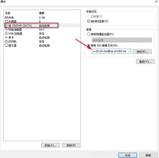 16)在(15)步驟中點擊“自定義硬件”選項后,在彈出的“硬件”配置框中,通過點選“新CD/DVD(SATA)”選項,可在右側的上下文菜單中指定所需使用的Ubuntu20.04 ISO鏡像文件;