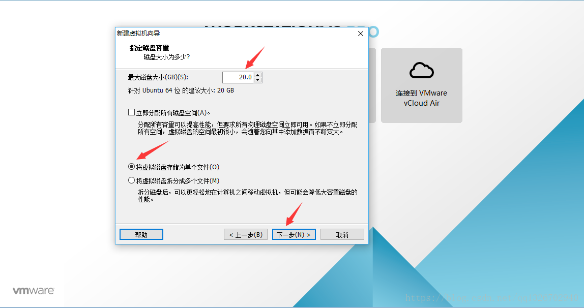 2.12)為虛擬機分配磁盤大小,按照個人電腦配置選擇,然后選擇 將虛擬磁盤存儲為單個文件,然后 點擊 下一步