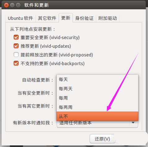 5、在自動檢查更新中,我們點擊之后,選擇“從不”,如圖示。