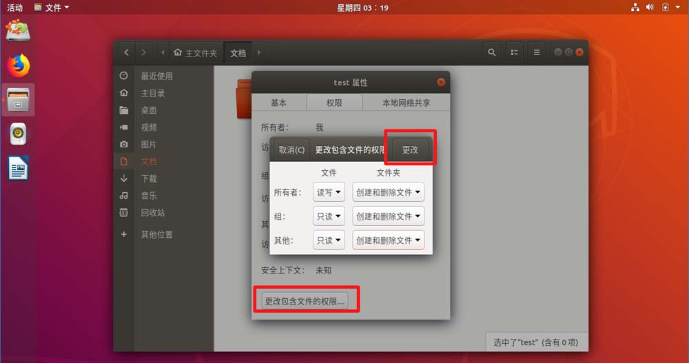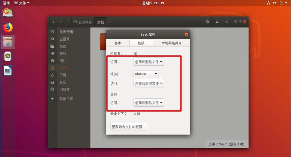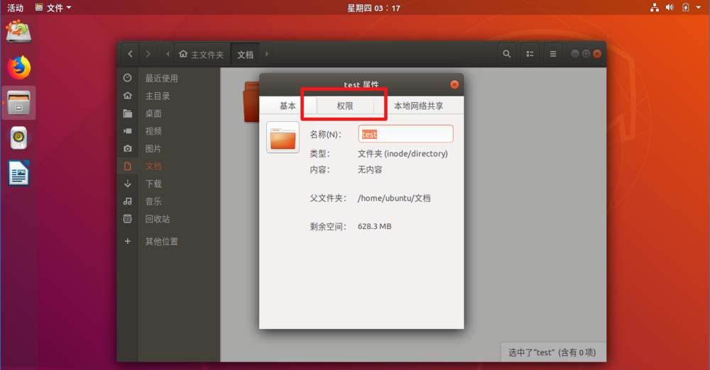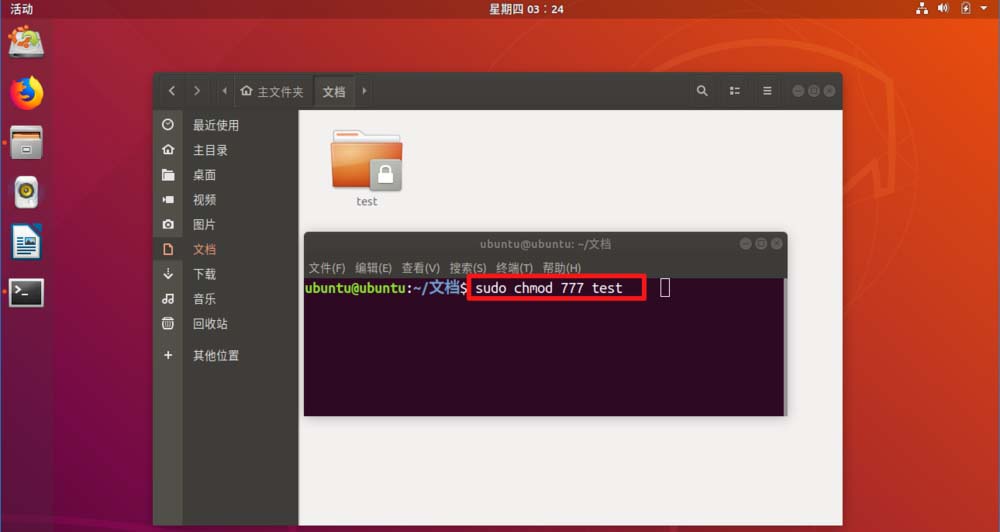 6、使用命令 sudo chmod 777 test 給與這個test文件夾讀寫權限。