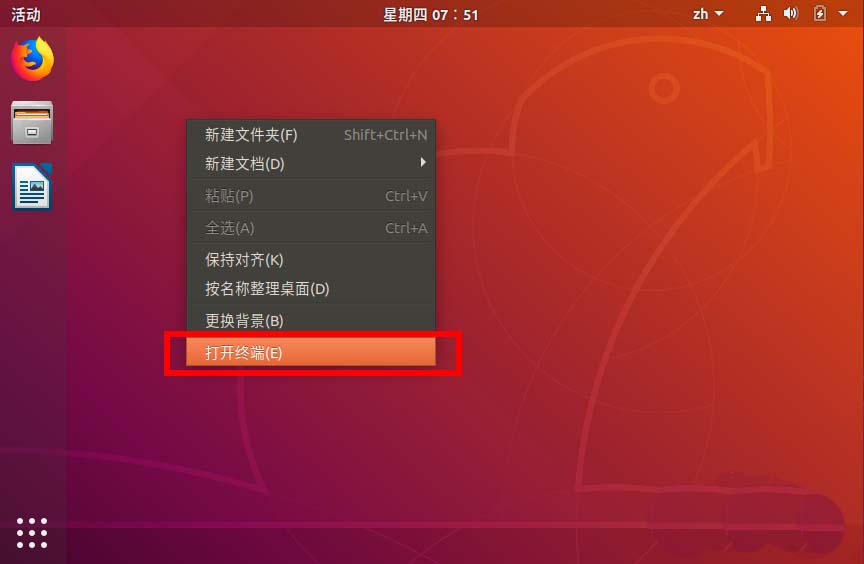 1、首先在ubuntu桌面上右鍵 打開終端。