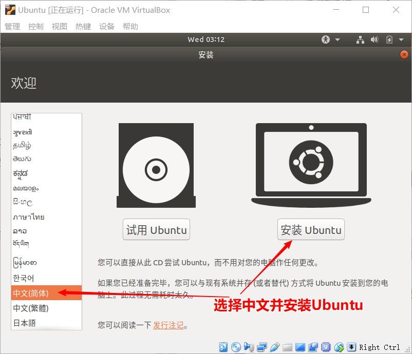 點擊啟動按鈕 > 開始安裝向導> 選擇中文 > 點擊安裝Ubuntu