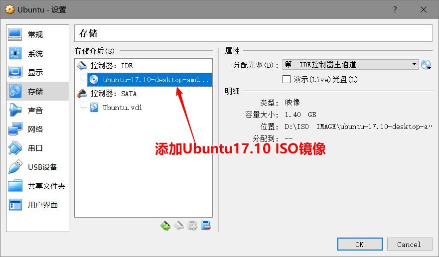 存儲-控制器IDE > 添加Ubuntu17.10 ISO鏡像