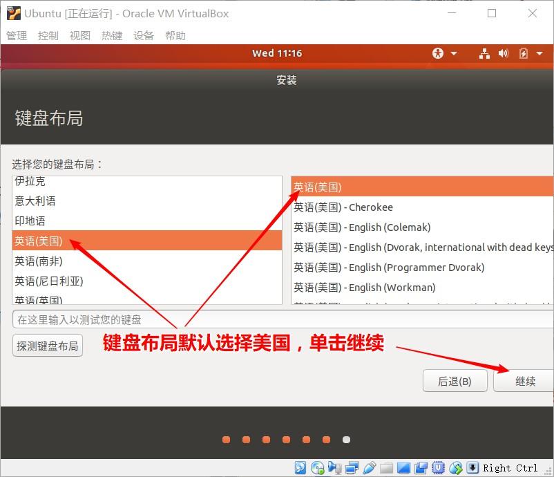 選擇默認鍵盤布局 美國 > 單擊繼續