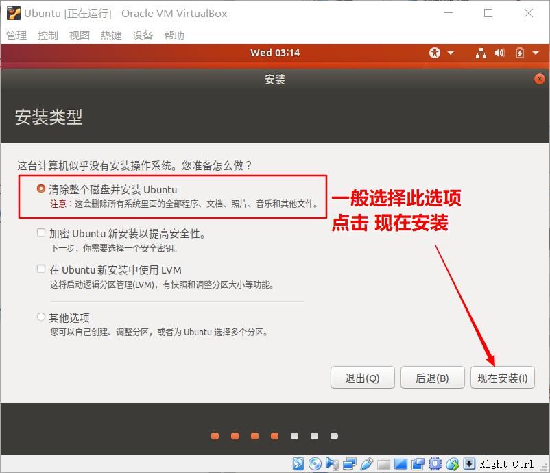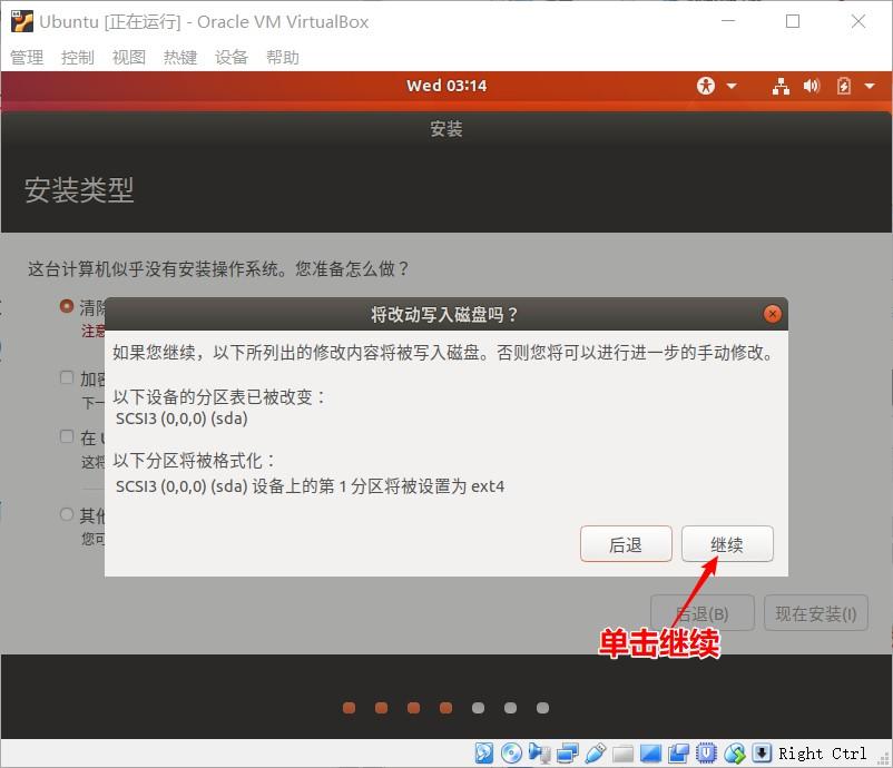 選擇清除整個磁盤并安裝Ubuntu > 單擊繼續