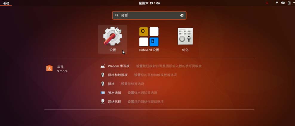 1、按下 Win 鍵,輸入“Settings”,或用中文輸入“設置”(輸入中文的話需要點擊輸入框、按 Ctrl + 空格切換中文輸入法),在搜索結果中點擊設置圖標,啟動設置窗口。當然,也可以點擊屏幕右上角的下拉箭頭,或者直接從 Dock 上啟動設置(如果已經將設置圖標固定到 Dock 上的話)。