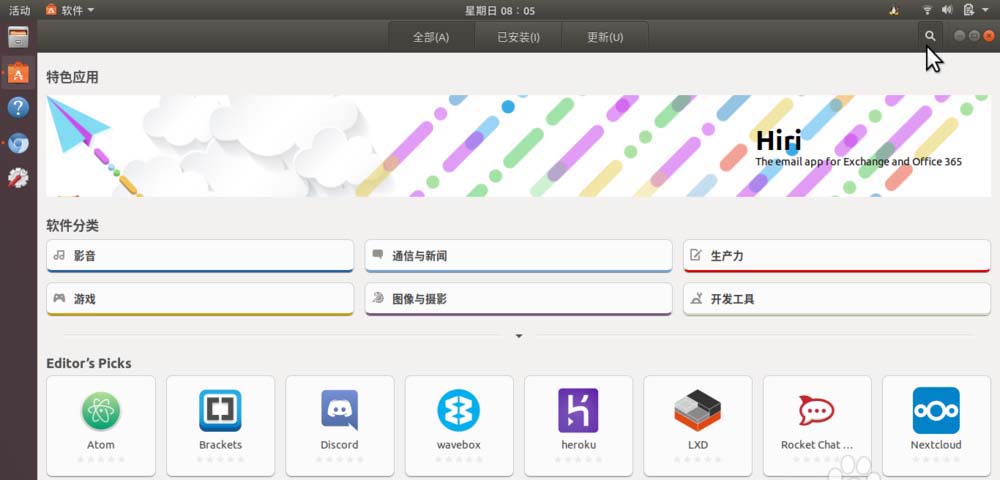 1、在桌面的Ubuntu Dock上,點(diǎn)擊橙色購物袋圖標(biāo)的軟件圖標(biāo),啟動(dòng)軟件窗口。