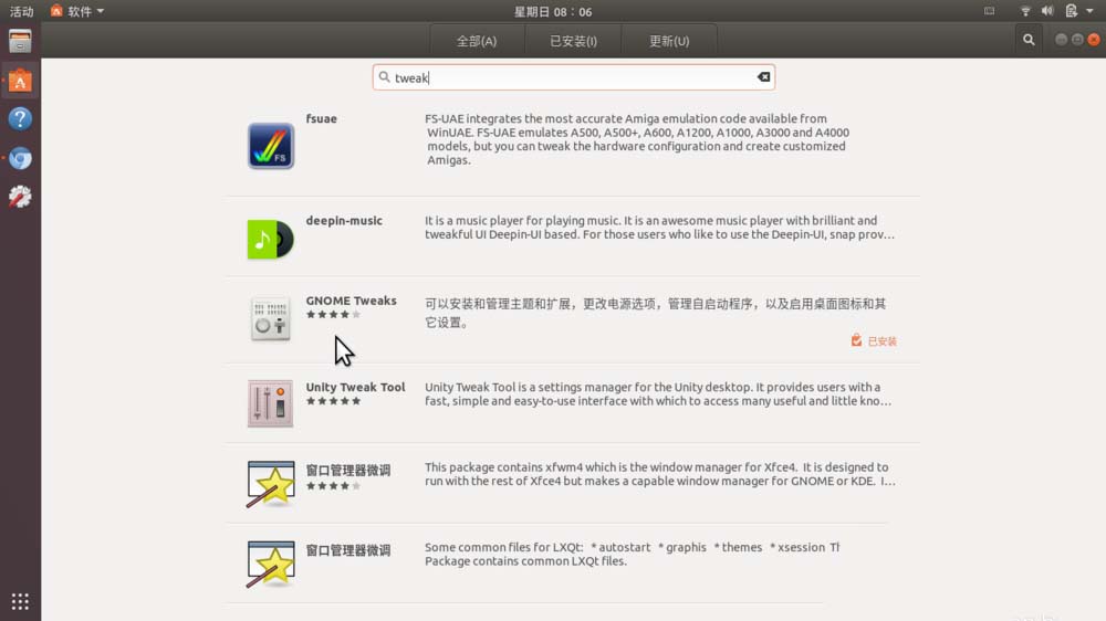 3、在搜索窗口中,輸入“tweak”或“優(yōu)化”,都能找到“Gnome Tweaks”這個(gè)軟件。點(diǎn)擊進(jìn)入詳情窗口,繼續(xù)點(diǎn)擊“安裝”,完成安裝“Gnome 優(yōu)化”這個(gè)軟件。