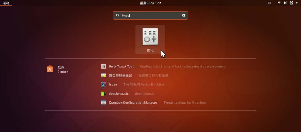 1、安裝好 Gnome 優(yōu)化軟件后,按下Win鍵進(jìn)入概覽視圖,在搜索框中輸入“tweak”或“優(yōu)化”,下方將會(huì)出現(xiàn) Gnome 優(yōu)化的圖標(biāo),點(diǎn)擊啟動(dòng)它。