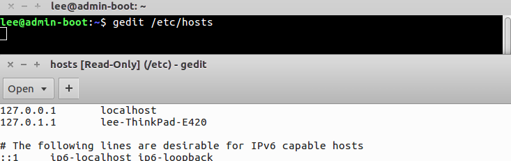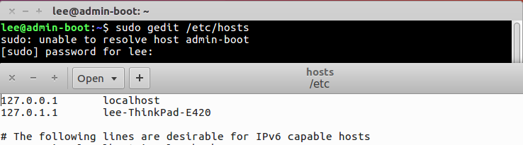 7、網(wǎng)絡(luò)上主機(jī)名稱修改需要輸入:sudo gedit /etc/hosts,如圖所示