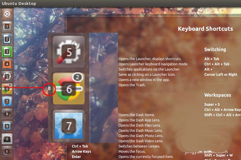 1、按住 Super 鍵不放,屏幕左側的 Launcher (程序啟動器)就會處于程序切換狀態,上面的每個程序圖標上都會出現一個數字,這時在鍵盤上按目標程序上的數字,該程序窗口就會處于當前窗口的位置。