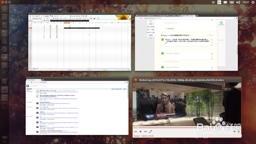 1、按 Super + w 組合鍵,會啟動“展覽”切換模式,所有窗口像展板被布置在展臺上一樣平鋪在整個桌面上,視覺上很酷,而且還有利于預覽各個程序窗口的具體內容。