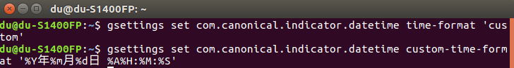 gsettings set com.canonical.indicator.datetime time-format 'custom'gsettings set com.canonical.indicator.datetime custom-time-format '%Y年%m月%d日 %A %H:%M:%S'