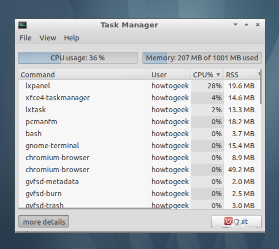 12、還有一個基本的任務管理器,在菜單中的系統工具下找到。它顯示總CPU和內存使用情況以及進程列表。右鍵單擊進程以將其殺死或更改其優先級。