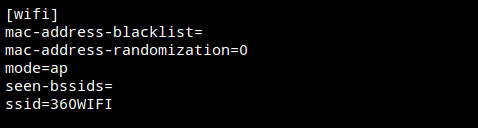 如我剛剛創建的是360WIFI,用編輯器打開這個文件(需用root權限打開),然后將wifi的那一節里面的mode值改成ap,這樣我們的wifi熱點就創建完成了。