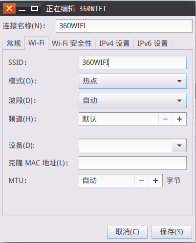 首先,創建一個普通的熱點,點擊右上角的網絡,然后選擇下拉菜單中的編輯連接,然后出現以下界面。