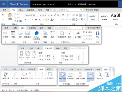 4、進(jìn)入編輯界面,可以看到可以使用的選項(xiàng)卡有“開始”、“插入”、“頁面布局”、“審閱”和“視圖”這幾個。為了讓大家看清楚,下圖截取了各個選項(xiàng)卡的截圖。
