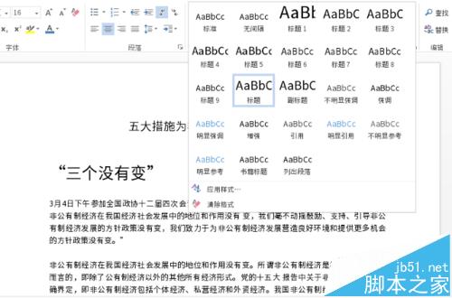 5、在開始選項(xiàng)卡中,“字體”、“段落”、“樣式”幾大功能板塊都有。比如,可以方便地為標(biāo)題段落設(shè)置樣式。