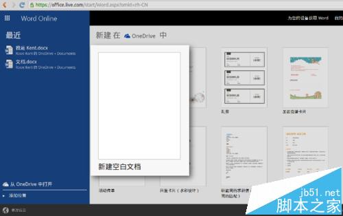 3、點(diǎn)擊第一個 Word 應(yīng)用,隨即進(jìn)入 Word Online 的主界面。該界面與桌面版 Office 2013 或 2016 都非常接近。點(diǎn)擊“新建空白文檔”按鈕,即可新建空白文檔。