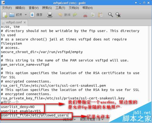 userlist_enable=YES userlist_file=/etc/allowed_users"和"seccomp_sandbox=NO"-->使文件中的"local_enable=YES"-->保存。