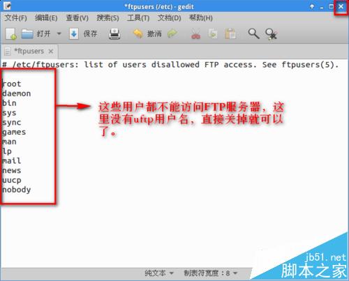 打開"終端窗口",輸入"sudo gedit /etc/ftpusers"-->回車-->打開這個文件后,看一看有沒有uftp這個用戶名,如果沒有,就直接退出。如果有就刪除uftp,因為這個文件中記錄的是不能訪問FTP服務器的用戶清單。