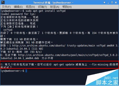 打開"終端窗口",輸入"sudo apt-get update"-->回車-->"輸入當前登錄用戶的管理員密碼"-->回車,就可以了。如果不運行該命令,直接安裝vsftpd,會出現"有幾個軟件包無法下載,您可以運行apt-get update------"的錯誤提示,導致無法安裝。