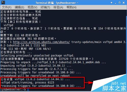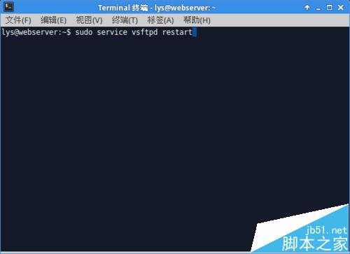 打開"終端窗口",輸入"sudo service vsftpd restart"重啟vsftpd服務-->回車-->vsftpd處于運行狀態,說明安裝成功。