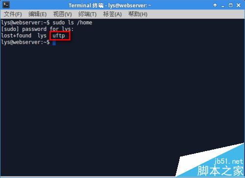 打開"終端窗口",輸入"sudo mkdir /home/uftp"-->回車-->輸入"sudo ls /home"-->回車-->有一個uftp目錄,目錄新建成功。