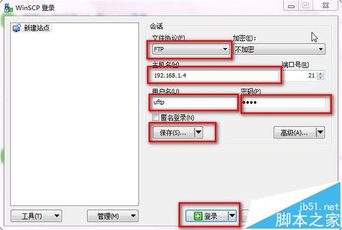 下載安裝WinSCP,運行WinSCP-->輸入IP、用戶名、密碼-->保存-->勾選"保存密碼"-->確定-->登錄-->登錄成功。