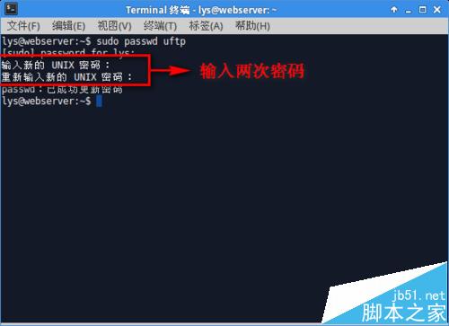 打開"終端窗口",輸入"sudo useradd -d /home/uftp -s /bin/bash uftp"-->回車-->用戶新建成功-->輸入"sudo passwd uftp"設置uftp用戶的密碼-->回車-->輸入兩次密碼-->回車-->密碼設置成功。
