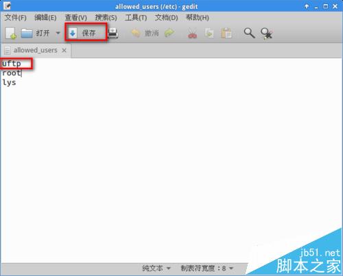 打開"終端窗口",輸入"sudo gedit /etc/allowed_users"-->回車-->輸入uftp-->保存, 文件創建成功。