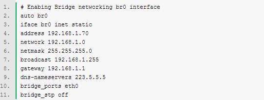 通常情況下,為了保證虛擬機與 Internet 的相互通信,我們需要在主機中啟動網(wǎng)絡(luò)橋接。為了保證不破壞原有的網(wǎng)絡(luò)配置,我們先使用如下命令將網(wǎng)絡(luò)配置文件進行備份: