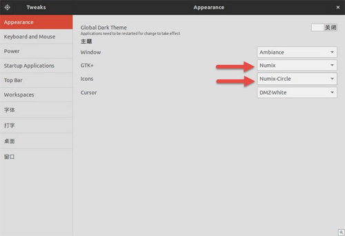 安裝好之后就打開 Unity Tweak Tool 優化工具,在 GTK + 中選擇使用 Numix 主題,并在 Icons 中選擇使用 Numix-Circle 系列圖標。