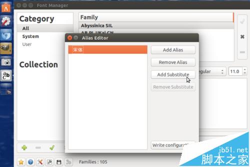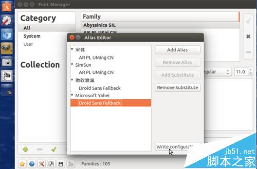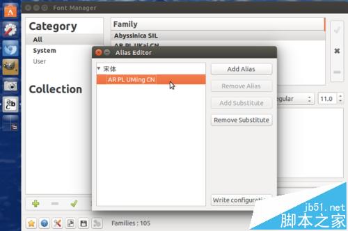 6、用同樣的方法,輸入以下字體及其替換:SimSun——AR PL UMing CN;黑體——Droid Sans Fallback;等等,如圖。
