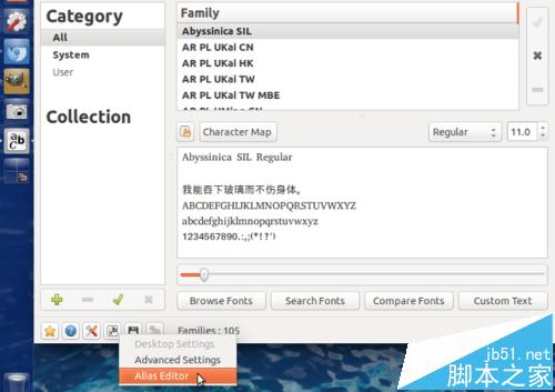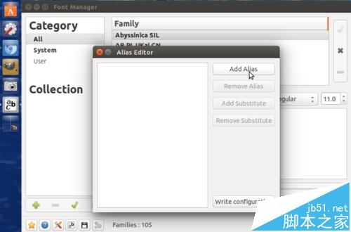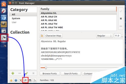 1、首先,要安裝一款叫做“Font Manager“的軟件。Font Manager 安裝完成后,點擊啟動它。待啟動完成后,在窗口左側下方,點擊字體設置按鈕(上面帶有a、b兩個字母的按鈕)。