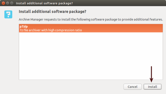 要解決該問題也十分簡單,在Ubuntu中安裝7-Zip包即可?,F(xiàn)在,你也許想知道如何在Ubuntu中安裝 7Zip吧?好吧,在前面的錯誤對話框中,如果你右擊“Search Command”搜索命令,它會查找可用的 p7zip 包。只要點擊“Install”安裝,如下圖: