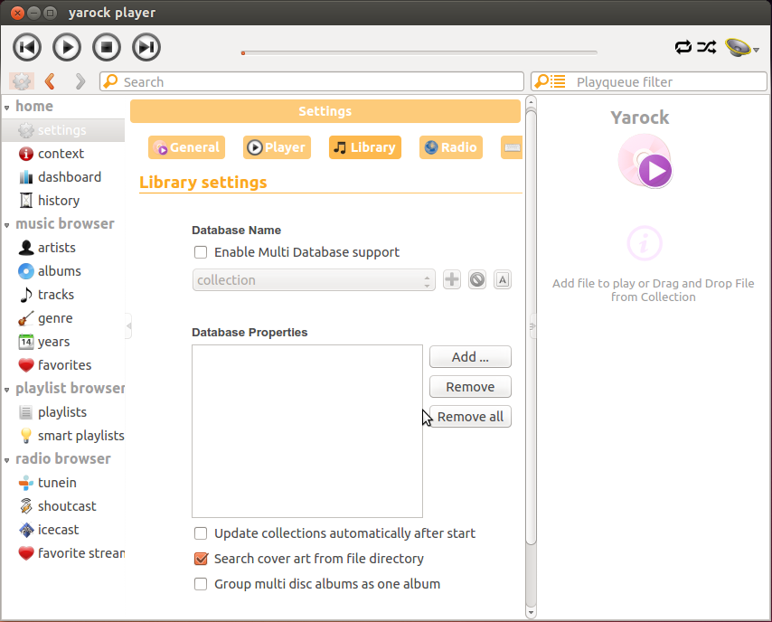 Yarock 是一款用 Qt4 開發(fā)的音樂播放器,支持的音樂文件格式有 mp3、Ogg、flac 等。最新版本為:Yarock 1.1.4,已經(jīng)發(fā)布了一段是了,現(xiàn)在用戶可通過 webupd8 的 PPA 進(jìn)行安裝。