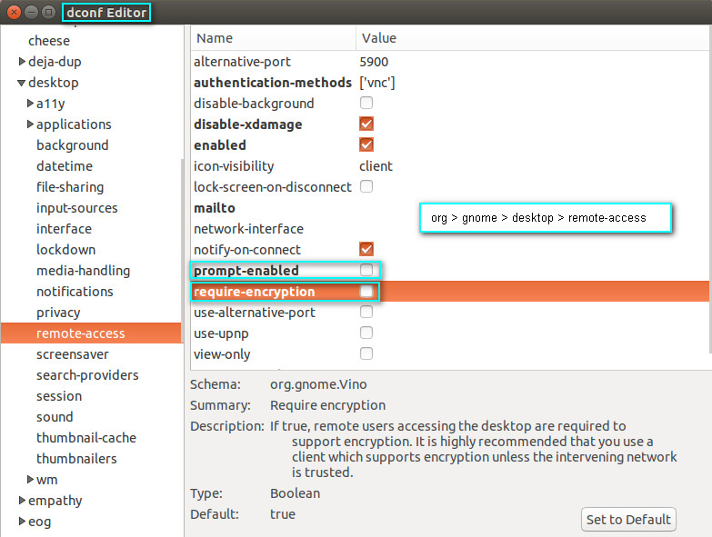2、需要通過Dconf-editor調整,打開終端(快捷鍵:Ctrl+Alt+T)輸入命令:dconf-editor 開啟,然后訪問如下配置路徑 org > gnome > desktop > remote-access;