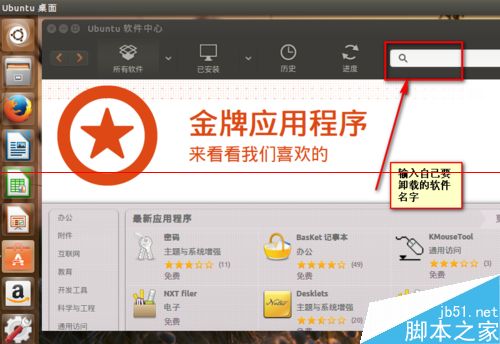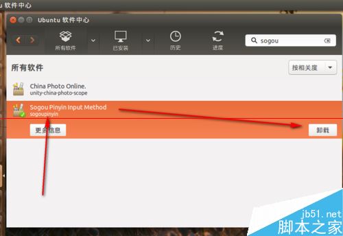 2、在打開后的“軟件中心”窗口中的有上側(cè)。我們在搜索框中輸入我們想要卸載的軟件名字,比如,我要卸載“搜狗”,那么我就在里面輸入“sogou”。ubuntu 中的搜狗就是這個(gè)名字。