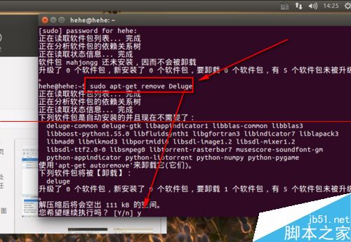 然后按enter鍵執(zhí)行。如果需要驗(yàn)證密碼,那么輸入密碼按回車鍵確定,如果需要輸入Y/N,那么就輸入Y后,按回車鍵繼續(xù)卸載。我這里卸載“Deluge”這個(gè)下載軟件。